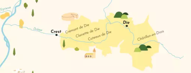 - Côteaux de Die et Châtillon-en-Diois sont des terroirs de montagne. On y trouve des vins tranquilles surprenants, notamment des blancs d'une grande pureté et des rouges (à base de Gamay ou Pinot Noir) qui respirent la fraîcheur alpine. Autour de Châtillon-en-Diois, des vins blancs à base d’Aligoté, Chardonnay ou Gamay rouge composent une palette aromatique fine et gourmande, idéale pour les pique-niques dans les vignes.